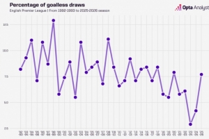 Opta指出,本賽季英超0-0比賽占比7.7%,2020-2021賽季(7.9%)之后最高。