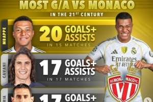 據統計,姆巴佩在面對老東家摩納哥的15場比賽中已經直接參與20球,在21世紀對陣摩納哥參與進球(進球+助攻)榜上位居第一,具體榜單如下: