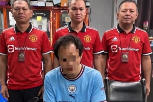 體育資訊1月22日訊 《太陽(yáng)報(bào)》報(bào)道,泰國(guó)警察逮捕了一名曼城球迷,他們還穿著曼聯(lián)球衣拍了他的逮捕照。