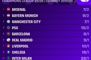 體育資訊1月22日訊 歐冠聯(lián)賽階段第7輪比賽戰(zhàn)罷,相關(guān)機(jī)構(gòu)給出了歐冠奪冠的最新賠率,阿森納居首,拜仁、曼城、巴黎前四。