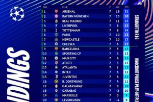 目前歐冠前二名阿森納和拜仁確定了直通16強名額,但有且僅有他們兩隊。從第3的皇馬往后數,有13支球隊將競爭直通淘汰賽的名額,其中第6巴黎到第13亞特蘭大均為13分,8隊同分競爭難度可想而知。