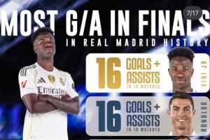 體育資訊01月23日訊 維尼修斯更新社媒,曬出自己在皇馬隊史決賽進球+助攻數(shù)的排名,他本人以16個進球+助攻與C羅、本澤馬和普斯卡什并列榜首!