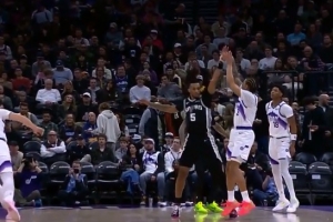 GIF-基昂特·喬治三分命中還加罰,卡斯?fàn)栆伤茐|腳被升級(jí)一級(jí)惡意犯規(guī)