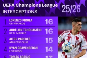 體育資訊1月23日訊 Squawka統計了球員本賽季歐冠的攔截次數,并列出榜單,瓊阿梅尼、皮羅拉16次居首。