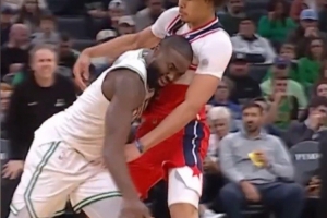 發際線粉事件之一:對陣奇才時杰倫·布朗發際線粉粘到對手白T上