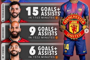 作為對比,曼聯球員本賽季參與進球最多的是B費,1763分鐘參與15球,鋒線三將姆伯莫參與9球、庫尼亞參與6球、舍什科參與6球。