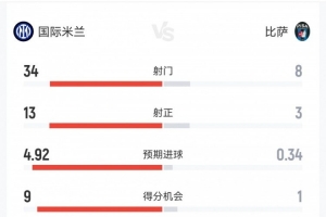 體育資訊1月24日訊 本輪意甲,國米讓二追六逆轉比薩。雙方全場重點數據對比如下↓(主隊國米在前)