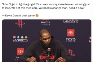 賽后,美媒Hoop Quotes曬出了杜蘭特的賽后采訪,他說道:“我不明白。我必須拿到35分才能勉強(qiáng)保持比賽的懸念,結(jié)果還是輸球。我們不應(yīng)該這么平庸。我們需要改變,現(xiàn)在就需要。哦不,我得去做我的工作了。無論輸贏,我還是能拿到數(shù)百萬的報(bào)酬。”