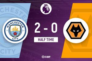 上半場傷停補時4分鐘,半場結束,曼城暫2-0狼隊。