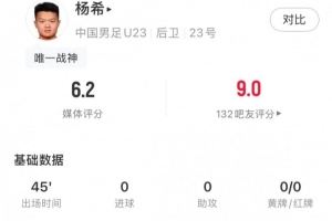 U23國足右邊后衛(wèi)楊希半場(chǎng)表現(xiàn)如下: