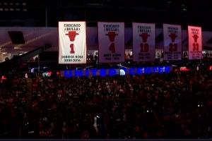 GIF-羅斯和家人們一起升起自己的公牛1號球衣