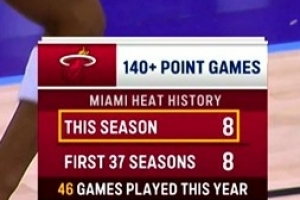 據統計,熱火本賽季8次單場140+,而隊史此前37個賽季合計8次。