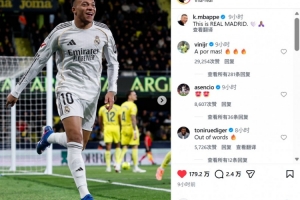 本場比賽姆巴佩梅開二度,其中包括一粒勺子點球。賽后姆巴佩也在社媒曬出本場慶祝進球照片,配文寫道:“這就是皇馬!”