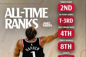 體育資訊1月25日訊 今天,快船官方曬出哈登生涯各項數據的歷史排名,詳情如下:
