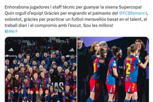 巴薩俱樂部主席拉波爾塔社媒曬出女足姑娘們與獎(jiǎng)杯的合照,并寫道:“恭喜球員們和教練團(tuán)隊(duì)贏得第六座西班牙超級(jí)杯,多么令人驕傲的一支球隊(duì)!”