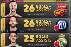 體育資訊11月10日訊 Score90統計了2025年五大聯賽中場球員在俱樂部+國家隊比賽中參與進球的數量,并列出榜單。