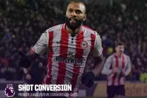 體育資訊1月25日訊 數據網站OPTA盤點了本賽季英超球員射門轉化率榜單,具體如下(至少20次射門):