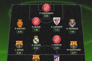 體育資訊11月10日訊 WhoScored列出了西甲第12輪最佳陣容,萊萬、拉什福德、亞馬爾、阿爾瓦雷斯、居萊爾在列。