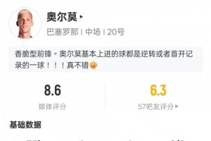 體育資訊1月26日訊 西甲第21輪,巴薩主場迎戰皇家奧維耶多。奧爾莫首發出戰,傳射建功,另外他還有1次過人和1次關鍵傳球,評分8.6。