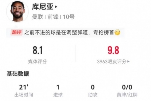 體育資訊1月26日訊 曼聯在本輪英超焦點戰3-2力克阿森納,庫尼亞本場數據如下:
