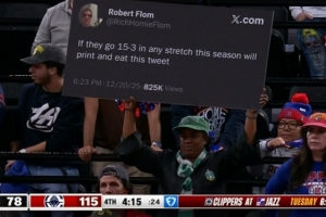 GIF-有球迷當時發推特說快船要打出15勝3負就把這條推特打印出來吃掉,這條被場邊球迷打印出來了