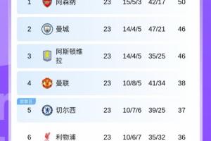 目前英超積分榜上,前六為阿森納、曼城、維拉、曼聯、切爾西、利物浦。