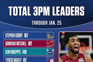 體育資訊1月27日訊 NBC曬出了賽季至今的球員三分命中數排行榜。其中庫里排名第一、米切爾第二、克尼佩爾第三。