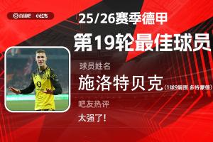 第19輪評選結果出爐,施洛特貝克全場打進1球送出9次解圍,攻防兩端完美發揮,幫助多特3-0完勝柏林聯合,當選【體育資訊X小紅書德甲第19輪最佳球員】!