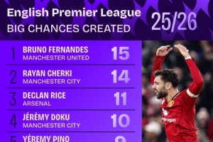 本賽季英超創(chuàng)造重大機(jī)會(huì)次數(shù)榜: