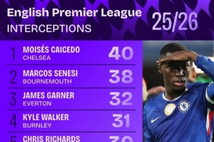 體育資訊1月27日訊 Squawka統計了本賽季球員在英超的攔截次數,并列出榜單,凱塞多40次居首。
