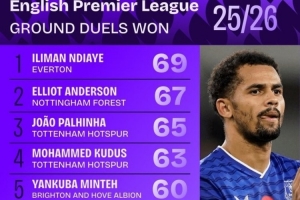 體育資訊11月11日訊 英超聯賽已經進行了11輪,squakwa也統計了本賽季英超地面成功對抗次數,埃弗頓前鋒恩迪亞耶居首。