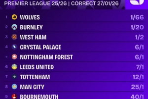體育資訊1月27日訊 Opta超級計(jì)算機(jī)預(yù)測了本賽季英超球隊(duì)的降級概率,狼隊(duì)99.87%最高,熱刺降級概率僅1.64%。