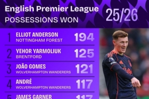 本賽季英超奪得球權次數排名: