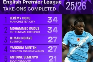 本賽季英超成功過人榜:
