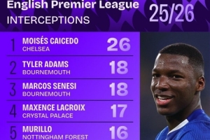 體育資訊11月11日訊 英超聯(lián)賽已經(jīng)進(jìn)行了11輪,squakwa也統(tǒng)計(jì)了本賽季英超攔截次數(shù)情況,凱塞多獨(dú)自領(lǐng)跑。