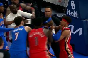 GIF-雷霆鵜鶘比賽都結束了 雙方爆發沖突 多特費爾斯互掐 費爾斯多次沖鋒被攔