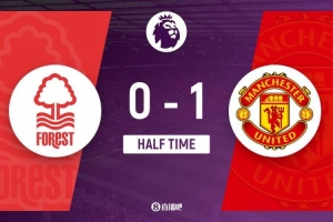 傷停補(bǔ)時(shí)3分鐘。上半場(chǎng)比賽結(jié)束,諾丁漢森林0-1曼聯(lián)。