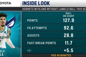 黃蜂自媒體曬出數據,當拉梅洛出站時,黃蜂每48分鐘凈負8.5分,當他缺陣時,48分鐘凈勝5.5分。