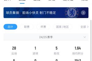斯特林目前31歲,2019年德轉身價一度高達1.6億歐,目前僅500萬歐。斯特林已經長達251天未出場,他上一次出場是2025年5月25日代表阿森納出戰伯恩茅斯。上賽季,斯特林各賽事出場28次,貢獻1球5助。