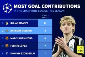 體育資訊1月29日訊 歐冠聯賽階段最后一輪比賽即將開賽,德國轉會市場盤點了參加歐冠球員參與進球數,姆巴佩11球居首,戈登、拉什福德8球位居次席。
