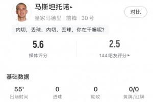 體育資訊1月29日訊 歐冠聯賽階段第8輪,皇馬客戰本菲卡,馬斯坦托諾代表皇馬首發出戰,在下半場第55分鐘被換下,球員此役數據如下: