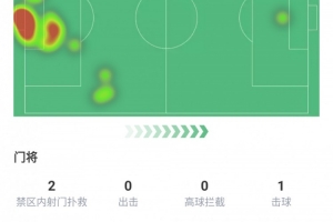 首發踢滿全場、撲救4次、禁區內射門撲救2次、擊球1次、進球1個
